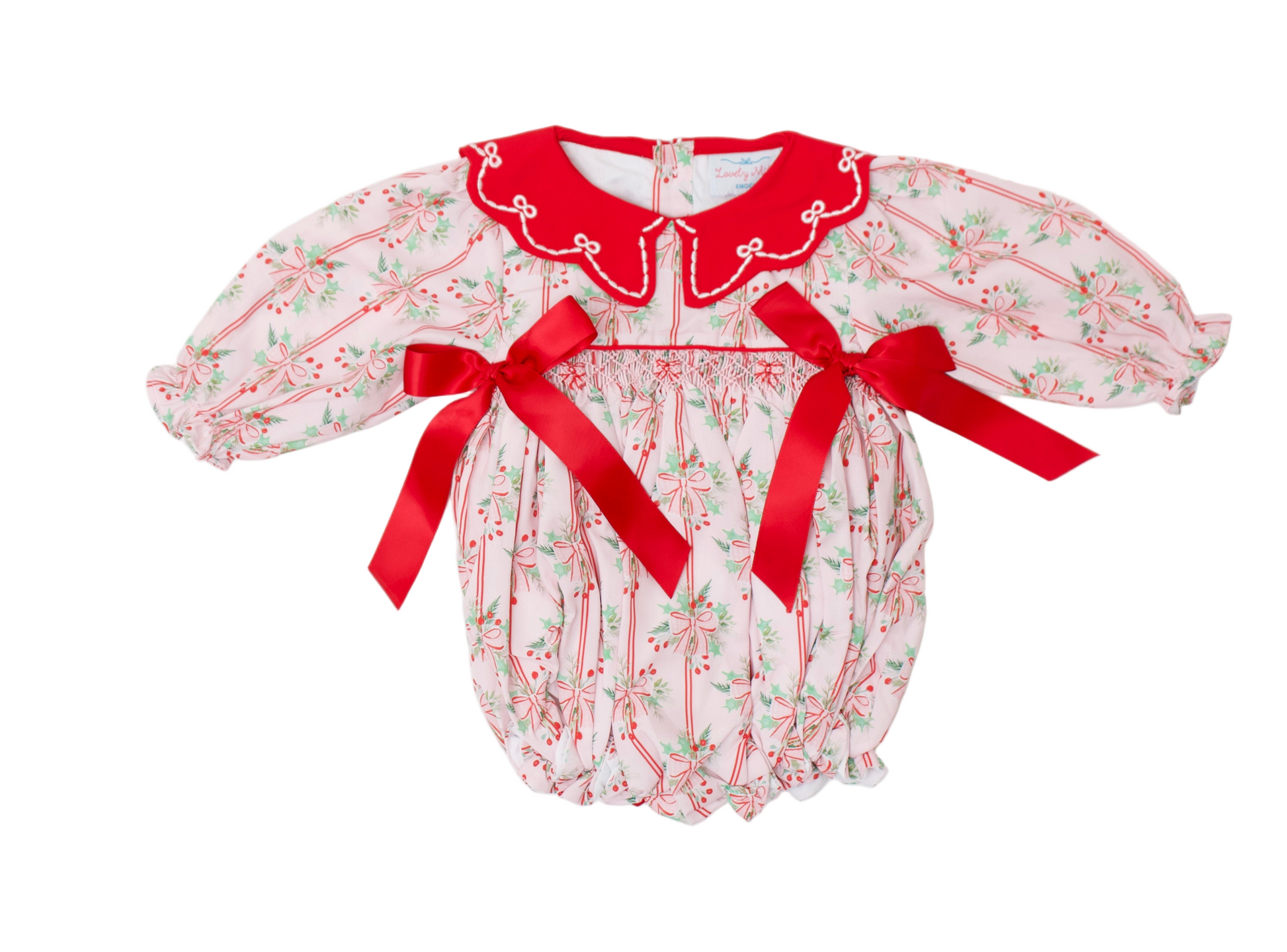 Have a holly jolly Christmas with this fun and festive hand-smocked holiday bubble, crafted in soft, woven fabric. Featuring classic smocking and a cheerful seasonal print, this timeless piece blends playful charm with heirloom-quality craftsmanship. Perfect for Christmas photos, holiday events, family gatherings, and every joyful moment of the season.