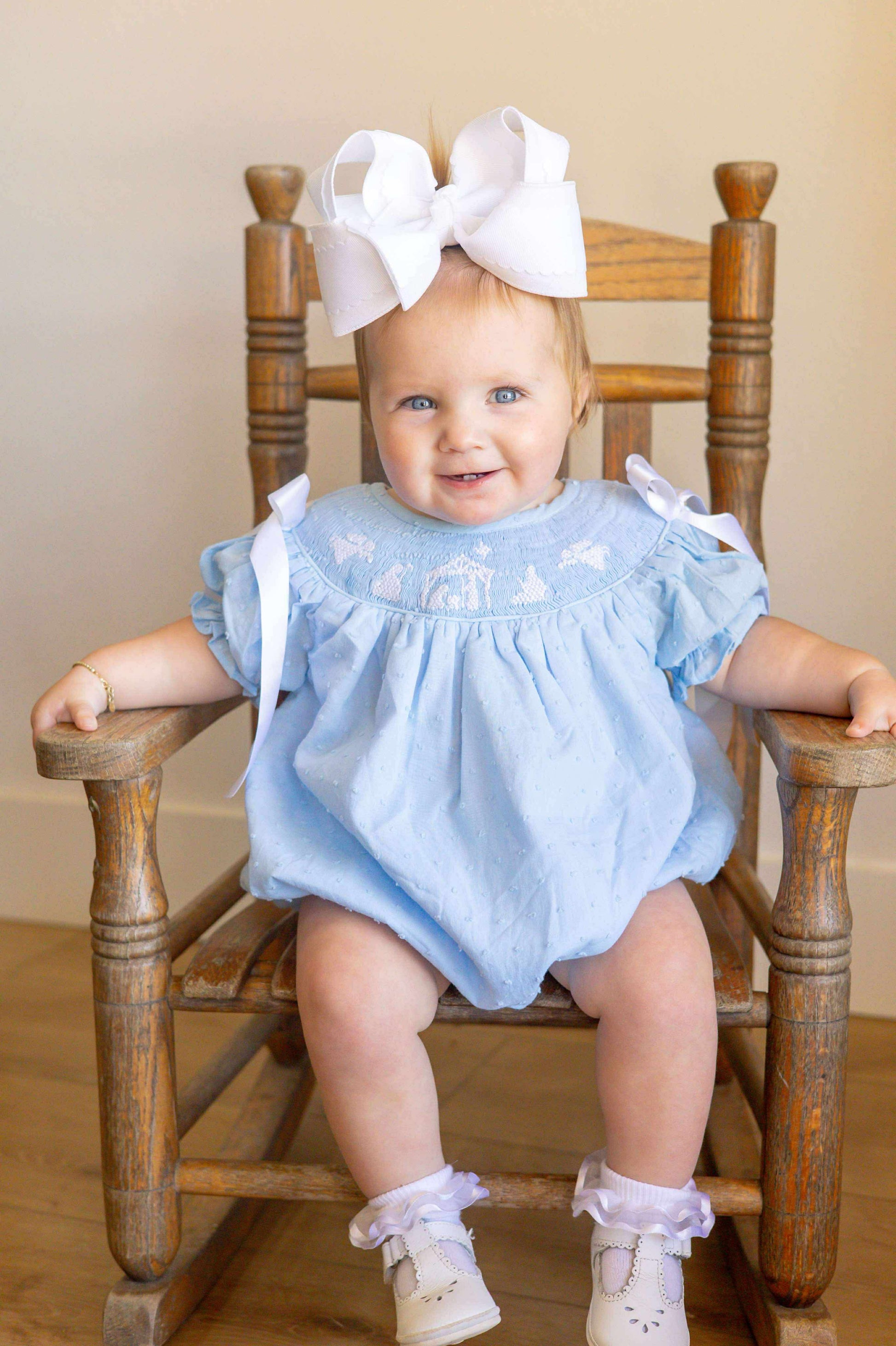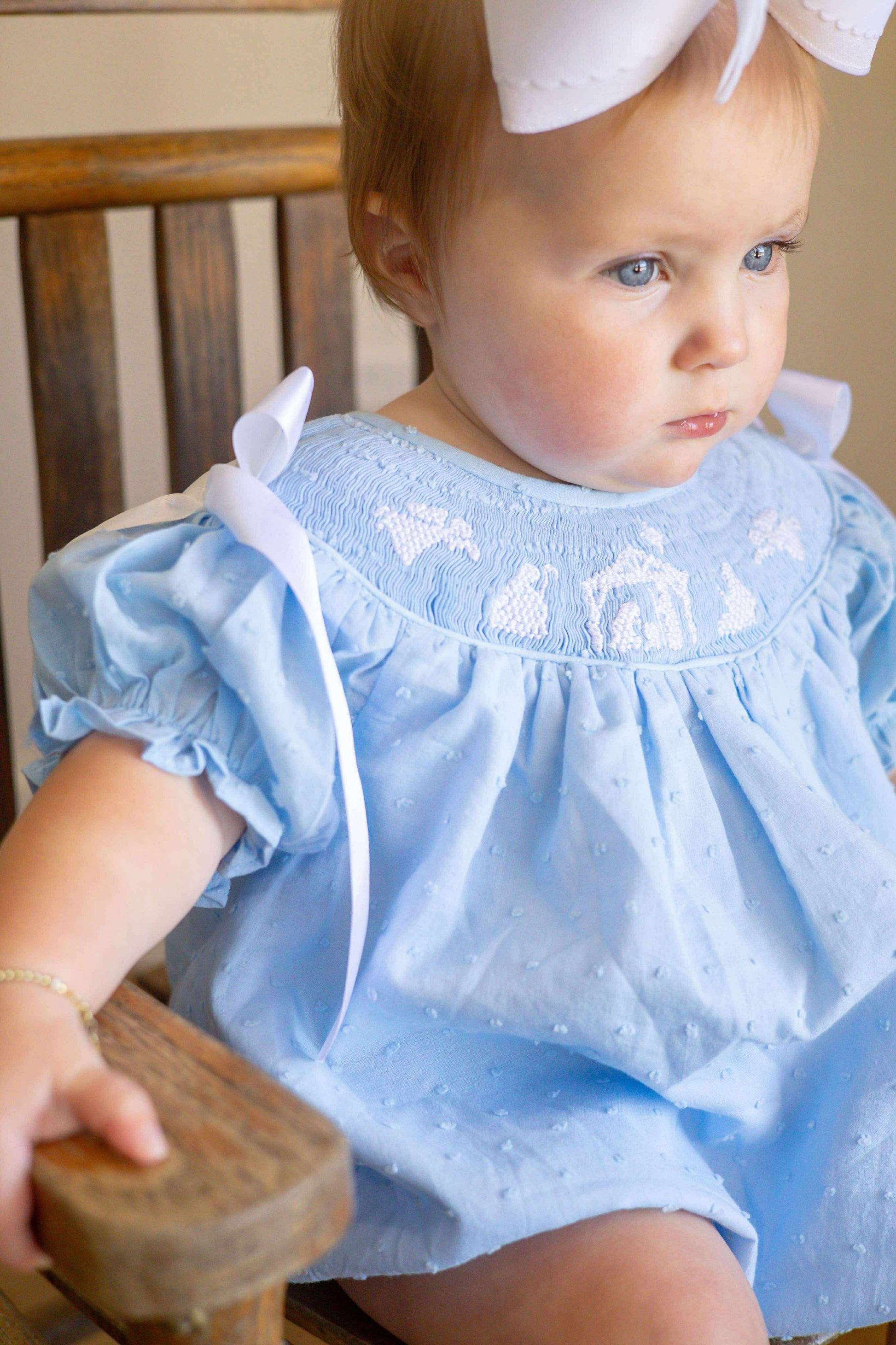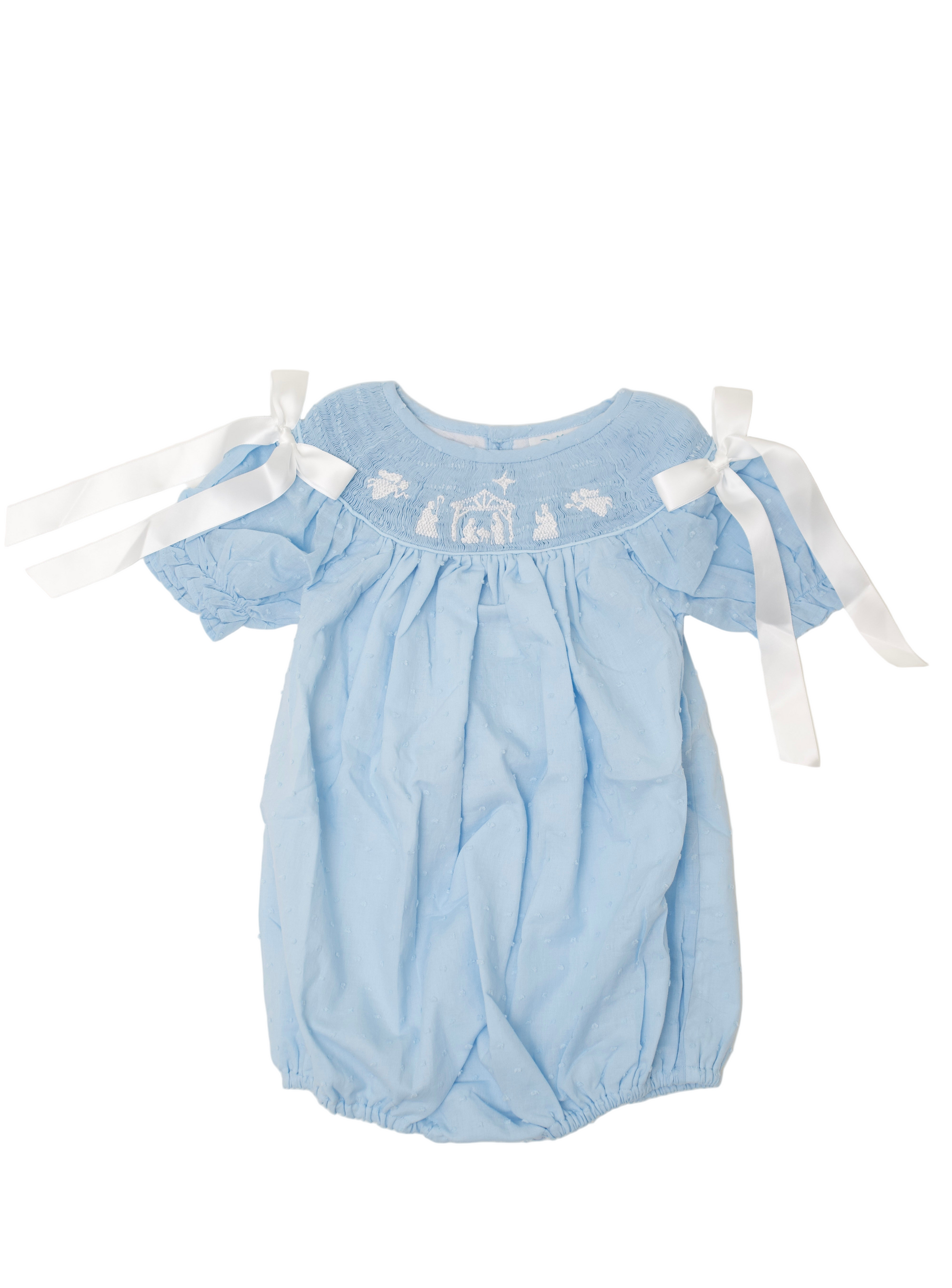The reason for the season! This beautiful hand-smocked Nativity bubble is crafted in soft, breathable 100% cotton woven fabric and adorned with timeless Nativity smocking that honors the true spirit of Christmas. Elegant, classic, and heirloom-quality, it’s perfect for holiday photos, church events, family gatherings, and every meaningful moment of the season. A cherished piece made to be passed down for years.