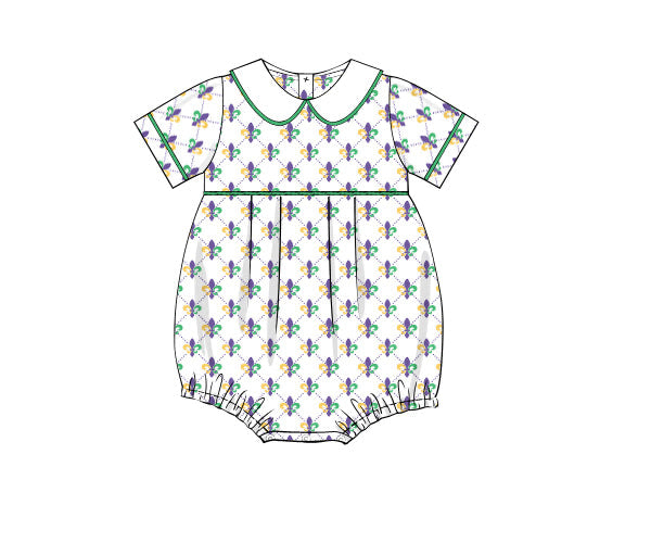 The Mardi Party Bubble for boys is a festive and cozy outfit designed for little ones. Made from comfortable knit fabric, it features a fun Fleur de Lis-inspired design for a playful, celebratory look.