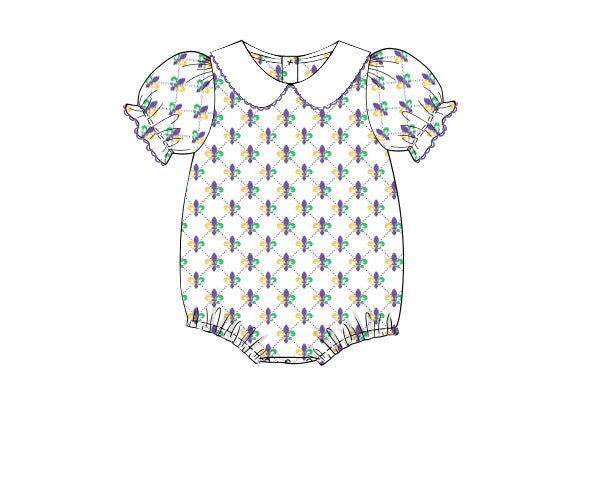 The Mardi Party Bubble is a festive and cozy outfit for little girls. Made from comfortable knit fabric, it features a fun Fleur de Lis-inspired design for a playful, celebratory look.