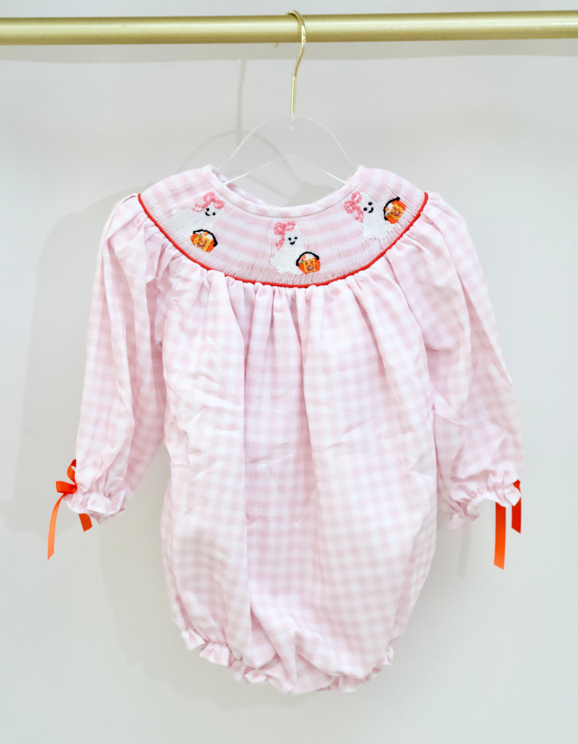 Ghosts & ghouls but make it cute! this bubble features a bishop neckline, long sleeves and smocked ghosts!