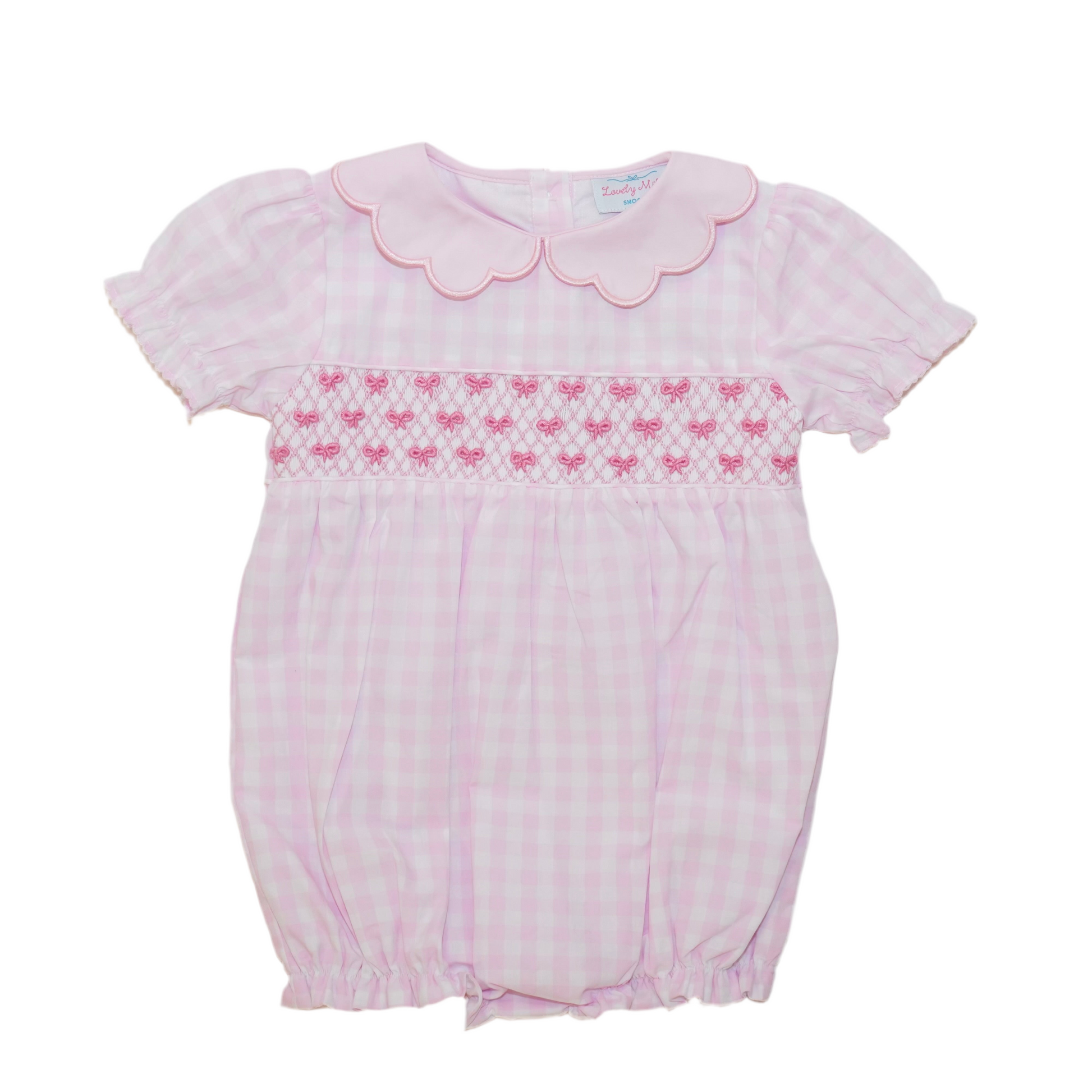 Our Pink Gingham Bows Bubble is a girly girl's dream! This bubble features dainty bow smocking and a scalloped collar.